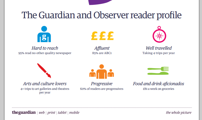 What this creates from an advertisers’ point of view is a very loyal and committed demographic who, by advertising their product or service in the Guardian, can exploit the trust and loyalty created by the Guardian brand. So, somewhere along the line, you begin to ask
