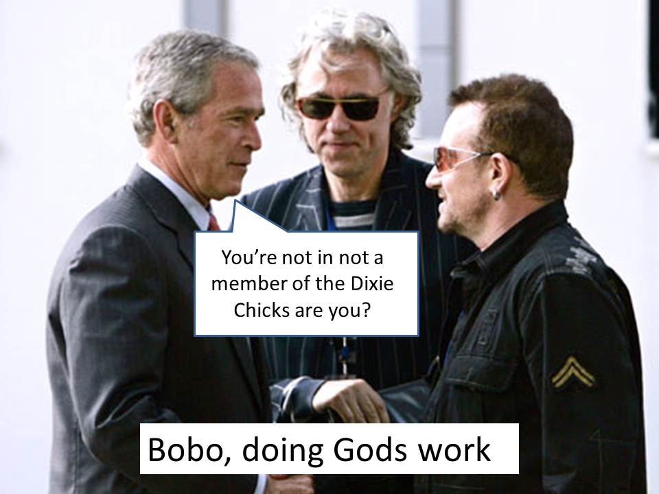 So people need to get off the Bobo hate fiesta and get with the program. Africa needs Sir Bob and Lord Bono and we need Africa to need Bobo, because we feel they need to be needed. As a society we need to take a big look in the mirror and ask ourselves “If we can’t care for the egocentric whims of obscenely rich talentless super stars, then who can we care for?”
