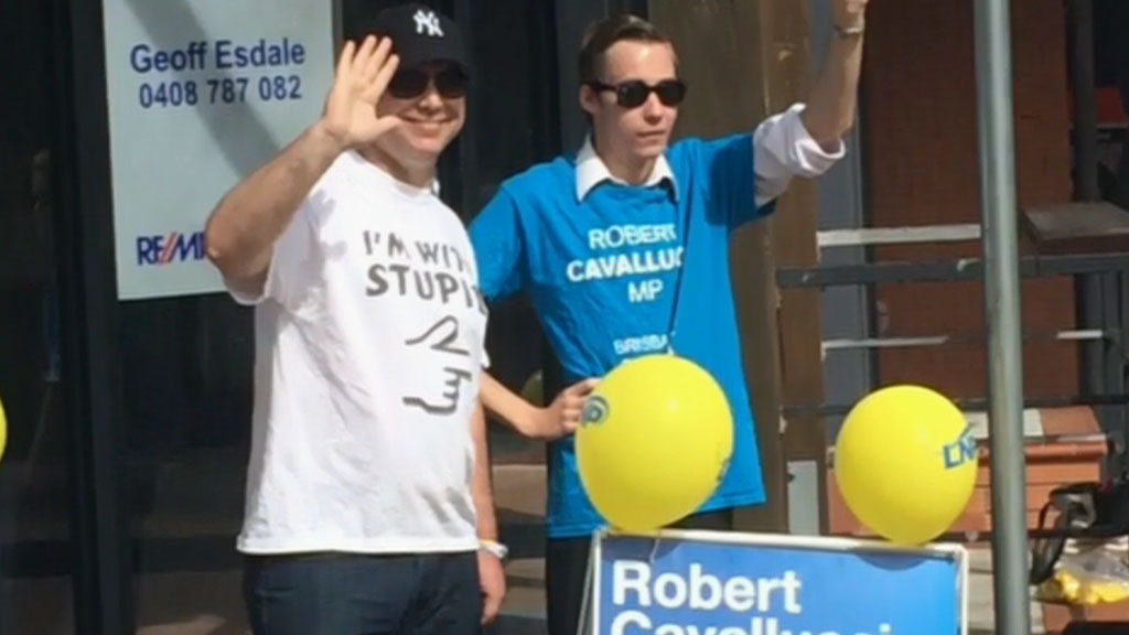 In life, everything is about proportion. One thing police forces around the world seem to be struggling with right now is finding the proportionate response to the problems they have to deal with, such as the situation of the lucky lad we covered previously who was forcibly removed from a plane travelling from Gold Coast to Melbourne for his terrorist doodles. Again in Australia we witnessed another inane and feeble-minded use of law enforcement when Brisbane police arrested Iain Fogerty ,of New Farm who wore a t-shirt imprinted with “I’m with stupid” and a finger pointing to his left. As the Queensland state election campaign kicked off, he positioned himself next to various NLP supporters, supposedly garnering a few laughs in what is normally the boring and predictable theatre of “my colour is better than your colour” that all these elections end up amounting to.