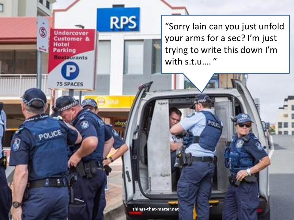 Given the glib nature of how political campaigns are run, and the smorgasbord of morons that currently control the Queensland government, let’s face it, he was the only person there that day reporting the truth. Getting complaints about a “public nuisance” on the loose, we had a crack squad of 10 armed police officers skilfully swarming down on the “public nuisance,” effectively shutting down his shenanigans pronto. Maybe someone had over-rostered too many police officers on that day and they were just bored. Yet taxpayers bear the cost for these 10 brainiacs to waste their time, process the paperwork, and occupy future court dates, all for something that could be solved with a simple, “Move along buddy, or we will book you.” The irony seemed to be lost on the 10 officers as they huddled around Mr. Fogerty as if they were attending something important, as the “I’m with stupid” finger went from aptly pointing to the NLP campaigners to pointing at the 10 idiot officers who went ahead and arrested him.