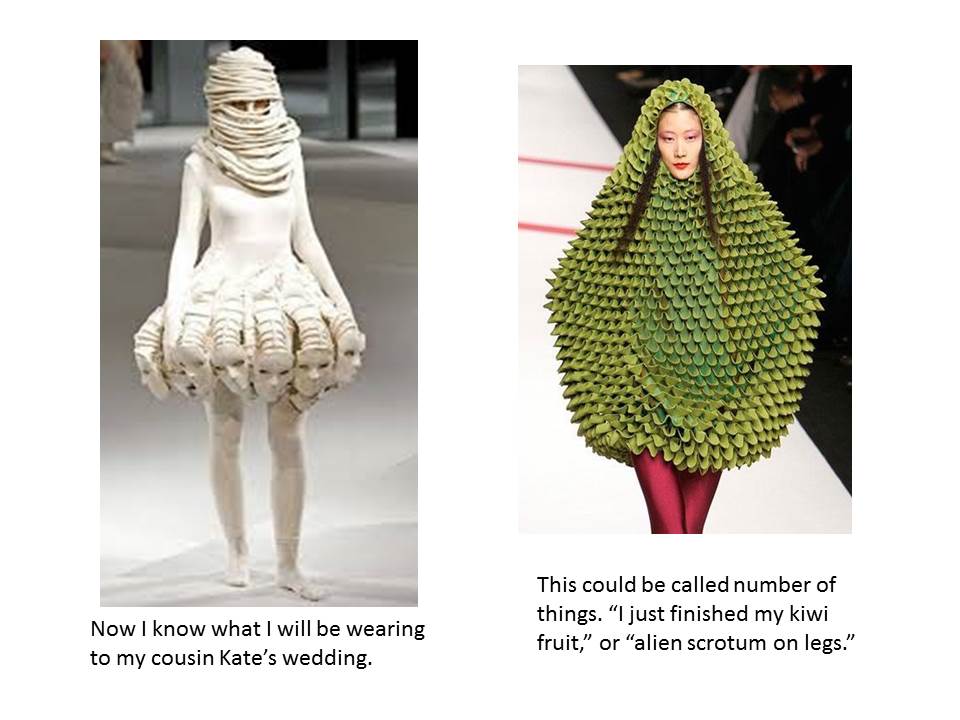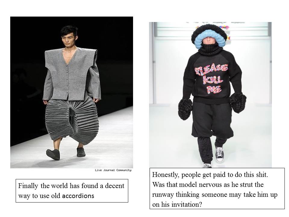 2. Hahahaha! This was great, nailed it. What I found most intriguing was that my friends from college who went into fashion will look at someone walking down the street and make fun of what they are wearing. They will continuously comment on someone’s outfit and proceed to make jokes like “didn’t know ___ was in town…” yet they can look at these pictures you posted, and like you said, take them seriously. Not all of them are like this, but the ones who are, I just want to look at them and say “WHO GIVES A FLYING FUCK?!” Excuse my language. But seriously, what someone is wearing should be the least of their concerns. It concerns me that that’s the first thing they see when they look at another person. And frankly, their ridiculous excuse to blindly hand over their credit card and willingly let some company rob them, and the outrageously expensive clothes they buy aren’t much better! Thanks for this post.