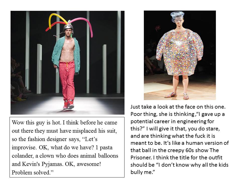 If we want to see how pointless and conceited fashion really is, just take a look at some of the bozos on a runway, not forgetting that all of what they wear may cost thousands of dollars. I know it’s easy to take pot-shots at how fucking useless and daft these clothes look, which is exactly why I am doing it.